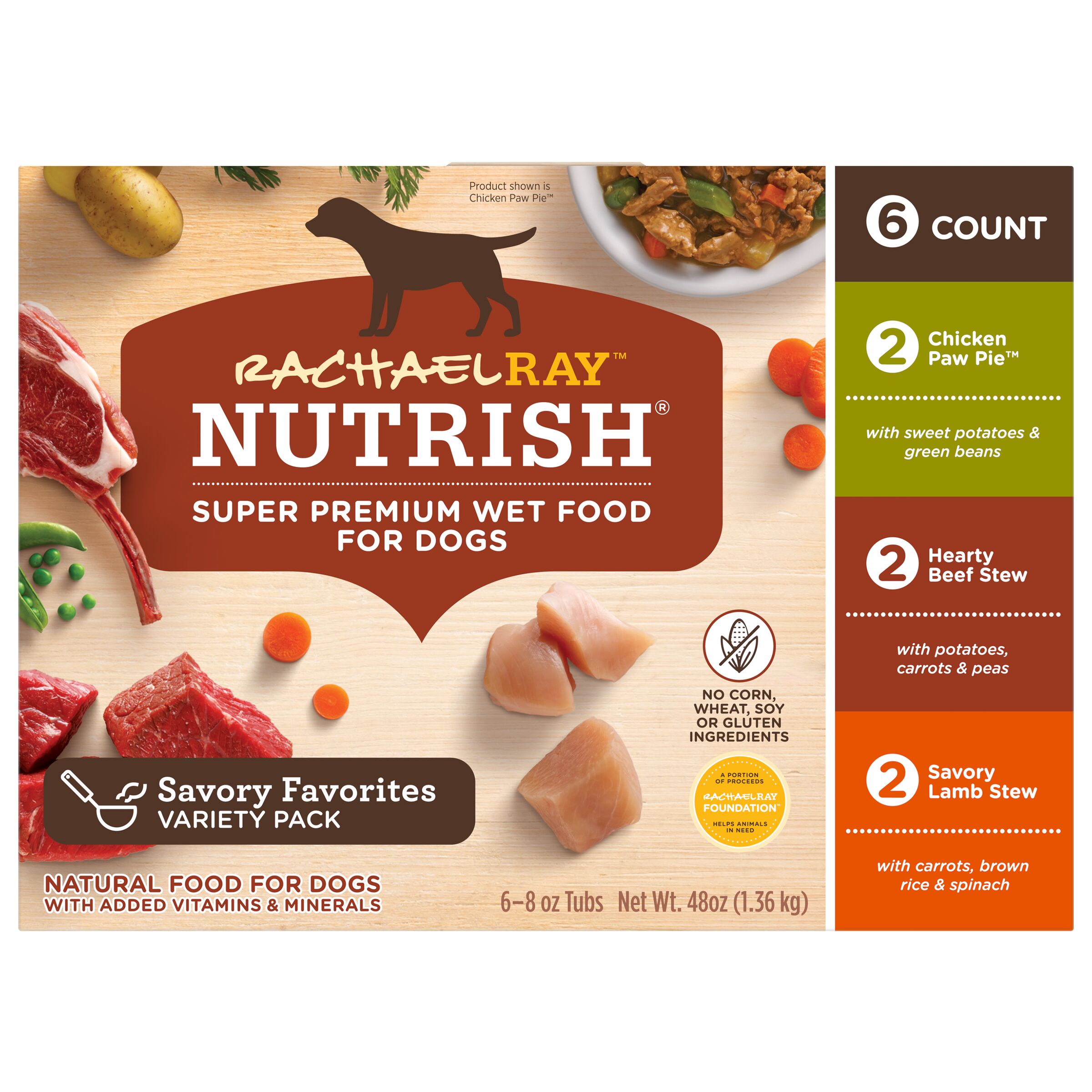 Rachael Ray Nutrish Savory Favorites Wet Dog Food Variety Pack contains 3 delicious flavors of our wet dog food:  Hearty Beef Stew, Chicken Paw Pie, and Savory Lamb Stew. Each mouth-watering recipe is made with simple, natural ingredients like real beef, chicken or lamb and wholesome veggies plus vitamins and minerals.